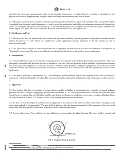 ASTM F870-23 is a standard published by ASTM International. Its full title is "Standard Practice for Tread Footprints of Passenger Car Tires Groove Area Fraction and Dimensional Measurements". This standard covers: SIGNIFICANCE AND USE 5.1 The tread of a tire, the annular band that contacts the pavement, normally contains geometric tread pattern elements that are defined by grooves or voids. These are employed to confer appropriate traction properties to the tire, mainly on wet or snow-covered roads. 5.2 One characteristic feature of tire tread patterns that is important for both traction and tire wear behavior is the percent or “fractional” groove area. The groove-area fraction is calculated with respect to the total or gross contact area. SCOPE 1.1 This practice covers a technique for measuring the groove or void area of a tire tread pattern. The void area is measured on the inked impression of a tire tread statically loaded against heavyweight paper on a load platen. 1.2 This procedure is intended to serve as a reference practice for measuring groove or tread pattern void areas in a tire-footprint impression. This technique is usable by any laboratory without special equipment although more sophisticated procedures are also commonly employed, such as optical or video camera processes. 1.3 The values stated in SI units are to be regarded as the standard. The values given in parentheses are for information only. 1.4 This standard does not purport to address all of the safety concerns, if any, associated with its use. It is the responsibility of the user of this standard to establish appropriate safety, health, and environmental practices and determine the applicability of regulatory limitations prior to use. 1.5 This international standard was developed in accordance with internationally recognized principles on standardization established in the Decision on Principles for the Development of International Standards, Guides and Recommendations issued by the World Trade Organization Technical Barriers to Trade (TBT) Committee.