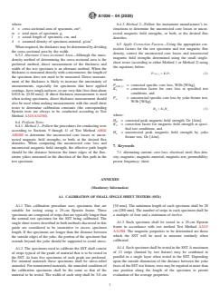 SIGNIFICANCE AND USE 4.1 Materials Evaluation—Small single sheet testers were developed to supplement the testing of Epstein specimens for various applications. They are especially appropriate for determining the magnetic properties of samples when insufficient material is available for preparation of an Epstein specimen. Although the small specimen size is attractive, the precision of the small sheet testers is not expected to be as good as that of the test method Test Method A343/A343M. Small sheet testers are frequently used to measure the properties of both fully processed and semiprocessed nonoriented and magnetic lamination steels. Specimens of semiprocessed steels are normally subjected to an appropriate quality development anneal prior to testing. Small sheet testers may also be used to evaluate oriented electrical steels in either the as sheared or stress-relief annealed condition. SCOPE 1.1 This guide covers procedures for interpreting the specific core loss and peak permeability determined using small single-sheet test systems. It is limited to single-sheet test systems that require a test specimen or coupon be cut from the material being tested and are designed such that the entire width of that test specimen is magnetized during testing. 1.2 This guide is primarily intended for measurements of the magnetic properties of flat-rolled electrical steels at frequencies of 50 Hz or 60 Hz under sinusoidal flux conditions. 1.3 This guide includes procedures to provide correlation with the 25-cm Epstein test method (Test Method A343/A343M). 1.4 The range of magnetic flux densities is governed by the properties of the test specimens and the instruments and test power source. Nonoriented electrical steels may be tested at magnetic flux densities up to about 16-kG [1.6T] for core loss. The maximum magnetic field strength for peak permeability testing is limited by the current carrying capacity of the magnetizing winding and the test power source. Single sheet testers are typically capable of testing at magnetic field strengths up to 50 Oe [4000 A/m] or more. 1.5 Within this guide, a small single sheet tester (small SST) is defined as a magnetic tester designed to test flat, rectangular sheet-type specimens. Typical specimens for these testers are square (or nearly so). The design of the small SST test fixture may be small enough to accommodate specimens about 5 by 5 cm or may be large enough to accommodate specimens about 36 by 36 cm. Specimens for a particular SST must be appropriate for the particular test fixture. 1.6 This guide covers two alternative test methods: Method 1 and Method 2. 1.6.1 Method 1 is an extension of Method 1 of Test Method A804/A804M, which describes a test fixture having two windings that encircle the test specimen and two low-reluctance, low-core loss ferromagnetic yokes that serve as flux return paths. The dimensions of the test fixture for Method 1 are not fixed but rather may be designed and built for any nominal specimen dimension within the limits given in 1.5. The power loss in this case is determined by measuring the average value of the product of primary current and induced secondary voltage. 1.6.2 Method 2 covers the use of a small single sheet tester, which employs a magnetizing winding, a magnetic flux sensing winding, and a magnetic field strength detector. The power loss in this case is determined by measuring the average value of the product of induced secondary voltage and magnetic field strength. 1.6.3 The calibration method described in the annex of this guide applies to both test methods. 1.7 The values and equations stated in customary (cgs-emu and inch-pound) or SI units are to be regarded separately as standard. Within this standard, SI units are shown in brackets. The values stated in each system may not be exact equivalents; therefore, each system shall be used independently of the other. Combining values from the two systems may resu...