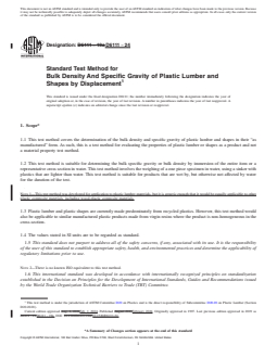 SIGNIFICANCE AND USE 5.1 The specific gravity or density of a solid is a property that can be measured conveniently to follow physical changes in a sample, to indicate degree of uniformity among different sampling units or specimens, or to indicate the average density of a large item. 5.2 It is possible that variations in density of a particular plastic lumber or shapes specimen will be due to changes in crystallinity, loss of plasticizer/solvent content, differences in degree of foaming, or to other causes. It is possible that portions of a sample will differ in density because of difference in crystallinity, thermal history, porosity, and composition (types or proportions of resin, plasticizer, pigment, or filler). Note 3: Reference is made to Test Method D1622/D1622M. 5.3 Density is useful for calculating strength to weight and cost to weight ratios. 5.4 If the cross-sectional area of the specimen is required for future testing on a particular sample, it is acceptable to determine it from a specific gravity measurement, see Eq 4. SCOPE 1.1 This test method covers the determination of the bulk density and specific gravity of plastic lumber and shapes in their “as manufactured” form. As such, this is a test method for evaluating the properties of plastic lumber or shapes as a product and not a material property test method. 1.2 This test method is suitable for determining the bulk specific gravity or bulk density by immersion of the entire item or a representative cross section in water. This test method involves the weighing of a one piece specimen in water, using a sinker with plastics that are lighter than water. This test method is suitable for products that are wet by, but otherwise not affected by water for the duration of the test. Note 1: This test method was developed for application to plastic lumber materials, but it is generic enough that it would be equally applicable to other plastic composite materials, including wood-plastic composite materials. 1.3 Plastic lumber and plastic shapes are currently made predominately from recycled plastics. However, this test method would also be applicable to similar manufactured plastic products made from virgin resins where the product is non-homogeneous in the cross-section. 1.4 The values stated in SI units are to be regarded as standard. 1.5 This standard does not purport to address all of the safety concerns, if any, associated with its use. It is the responsibility of the user of this standard to establish appropriate safety, health, and environmental practices and determine the applicability of regulatory limitations prior to use. Note 2: There is no known ISO equivalent to this test method. 1.6 This international standard was developed in accordance with internationally recognized principles on standardization established in the Decision on Principles for the Development of International Standards, Guides and Recommendations issued by the World Trade Organization Technical Barriers to Trade (TBT) Committee.