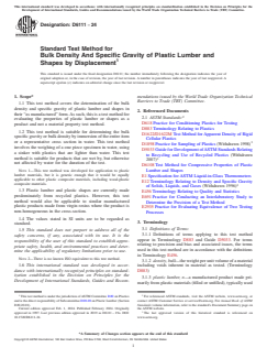 ASTM D6111-24: Standard Test Method for Bulk Density and Specific Gravity of Plastic Lumber and Shapes by Displacement is an internationally recognized testing standard developed by ASTM International. This standard specifies a method for determining the bulk density and specific gravity of plastic lumber and shapes, including composite and recycled plastic materials, using immersion displacement techniques. The procedure provides a reliable means to evaluate the physical properties of plastic lumber products in their "as manufactured" form, making it highly relevant for manufacturers, quality control labs, and product specifiers in the plastics, construction, and recycling industries.