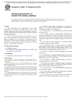 ASTM F2058-07(2021) is a technical specification published by ASTM International. Its full title is "Standard Specification for Candle Fire Safety Labeling". This standard covers: ABSTRACT This specification covers requirements for fire safety information to be placed on candle units of sale. It also includes requirements that retailers and distributors shall follow. Fire safety warnings will help ensure that information concerning the safe use of candles is presented to consumers to help prevent fires. The fire safety warning must be placed on the unit of sale and shall be visible to the consumer at the point of sale. The fire safety warning shall not be covered, obstructed, or removed by the manufacturer, distributor or retailer. The text-only fire safety warning shall consist of the safety alert symbol followed immediately by the signal word “WARNING” in uppercase boldface letters. The text-and-pictogram fire safety warning shall consist of the safety alert symbol followed immediately by the pictograms. SIGNIFICANCE AND USE 5.1 Fire safety warnings will help ensure that information concerning the safe use of candles is presented to consumers to help prevent fires. SCOPE 1.1 This specification covers requirements for fire safety information to be placed on candle units of sale. It also includes requirements that retailers and distributors shall follow. It is not the intent of this specification to address any other labeling requirements.2 1.2 This international standard was developed in accordance with internationally recognized principles on standardization established in the Decision on Principles for the Development of International Standards, Guides and Recommendations issued by the World Trade Organization Technical Barriers to Trade (TBT) Committee.