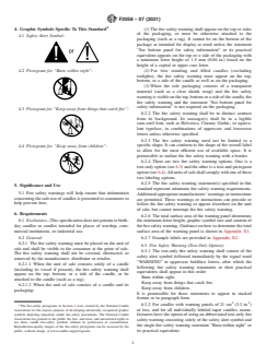 ABSTRACT This specification covers requirements for fire safety information to be placed on candle units of sale. It also includes requirements that retailers and distributors shall follow. Fire safety warnings will help ensure that information concerning the safe use of candles is presented to consumers to help prevent fires. The fire safety warning must be placed on the unit of sale and shall be visible to the consumer at the point of sale. The fire safety warning shall not be covered, obstructed, or removed by the manufacturer, distributor or retailer. The text-only fire safety warning shall consist of the safety alert symbol followed immediately by the signal word “WARNING” in uppercase boldface letters. The text-and-pictogram fire safety warning shall consist of the safety alert symbol followed immediately by the pictograms. SIGNIFICANCE AND USE 5.1 Fire safety warnings will help ensure that information concerning the safe use of candles is presented to consumers to help prevent fires. SCOPE 1.1 This specification covers requirements for fire safety information to be placed on candle units of sale. It also includes requirements that retailers and distributors shall follow. It is not the intent of this specification to address any other labeling requirements.2 1.2 This international standard was developed in accordance with internationally recognized principles on standardization established in the Decision on Principles for the Development of International Standards, Guides and Recommendations issued by the World Trade Organization Technical Barriers to Trade (TBT) Committee.