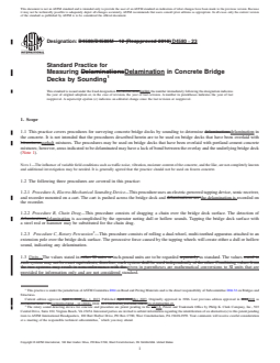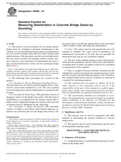 1.1 This practice covers procedures for surveying concrete bridge decks by sounding to determine delamination in the concrete. It is not intended that the procedures described herein are to be used on bridge decks that have been overlaid with asphalt mixtures. The procedures may be used on bridge decks that have been overlaid with portland cement concrete mixtures; however, areas indicated to be delaminated may have a lack of bond between the overlay and the underlying bridge deck (Note 1).