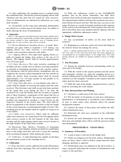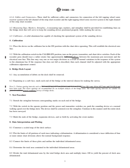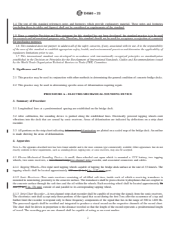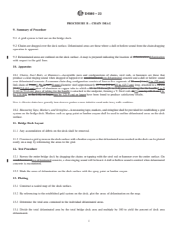 SIGNIFICANCE AND USE 2.1 This practice may be used in conjunction with other methods in determining the general condition of concrete bridge decks. 2.2 This practice may be used in determining specific areas of delamination requiring repair. SCOPE 1.1 This practice covers procedures for surveying concrete bridge decks by sounding to determine delamination in the concrete. It is not intended that the procedures described herein are to be used on bridge decks that have been overlaid with asphalt mixtures. The procedures may be used on bridge decks that have been overlaid with portland cement concrete mixtures; however, areas indicated to be delaminated may have a lack of bond between the overlay and the underlying bridge deck (Note 1). Note 1: The influence of variable field conditions such as traffic noise, vibration, moisture content of the concrete, and the like, are not completely known and additional investigation may be needed. It is generally agreed that the practice should not be used on frozen concrete. 1.2 The following three procedures are covered in this practice: 1.2.1 Procedure A, Electro-Mechanical Sounding Device—This procedure uses an electric-powered tapping device, sonic receiver, and recorder mounted on a cart. The cart is pushed across the bridge deck and the delamination is recorded on the recorder. 1.2.2 Procedure B, Chain Drag—This procedure consists of dragging a chain over the bridge deck surface. The detection of delamination is accomplished by the operator noting dull or hollow sounds. Tapping the bridge deck surface with a steel rod or hammer may be substituted for the chain drag. 1.2.3 Procedure C, Rotary Percussion2—This procedure consists of rolling a dual-wheel, multi-toothed apparatus attached to an extension pole over the bridge deck surface. The percussive force caused by the tapping wheels will create either a dull or hollow sound, indicating any delamination. 1.3 Units—The values stated in inch-pound units are to be regarded as standard. The values given in parentheses are mathematical conversions to SI units that are provided for information only and are not considered standard. 1.4 The text of this standard references notes and footnotes which provide explanatory material. These notes and footnotes (excluding those in tables and figures) shall not be considered as requirements of the standard. 1.5 Since a complete Precision and Bias statement for this standard has not been developed, the standard practice is to be used for research and informational purposes only. Therefore, this standard should not be used for acceptance or rejection of a material for purchasing purposes. 1.6 This standard does not purport to address all of the safety concerns, if any, associated with its use. It is the responsibility of the user of this standard to establish appropriate safety, health, and environmental practices and determine the applicability of regulatory limitations prior to use. 1.7 This international standard was developed in accordance with internationally recognized principles on standardization established in the Decision on Principles for the Development of International Standards, Guides and Recommendations issued by the World Trade Organization Technical Barriers to Trade (TBT) Committee.