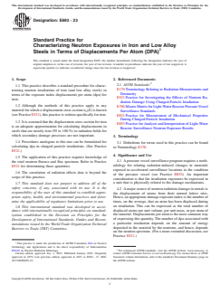 SIGNIFICANCE AND USE 4.1 A pressure vessel surveillance program requires a methodology for relating radiation-induced changes in materials exposed in accelerated surveillance locations to the condition of the pressure vessel (see Practice E853). An important consideration is that the irradiation exposures be expressed in a unit that is physically related to the damage mechanisms. 4.2 A major source of neutron radiation damage in metals is the displacement of atoms from their normal lattice sites. Hence, an appropriate damage exposure index is the number of times, on the average, that an atom has been displaced during an irradiation. This can be expressed as the total number of displaced atoms per unit volume, per unit mass, or per atom of the material. Displacements per atom is the most common way of expressing this quantity. The number of dpa associated with a particular irradiation depends on the amount of energy deposited in the material by the neutrons, and hence, depends on the neutron spectrum. (For a more extended discussion, see Practice E521.) 4.3 No simple correspondence exists in general between dpa and a particular change in a material property. A reasonable starting point, however, for relative correlations of property changes produced in different neutron spectra is the dpa value associated with each environment. That is, the dpa values themselves provide a spectrum-sensitive index that may be a useful correlation parameter, or some function of the dpa values may affect correlation. 4.4 Since dpa is a construct that depends on a model of the neutron interaction processes in the material lattice, as well as the cross section (probability) for each of these processes, the value of dpa would be different if improved models or cross sections are used. The calculated displacement cross section for ferritic iron, as given in this practice, is determined by the procedure given in 6.3. The currently recommended iron displacement cross section in this practice (Table 1) wa... SCOPE 1.1 This practice describes a standard procedure for characterizing neutron irradiations of iron (and low alloy steels) in terms of the exposure index displacements per atom (dpa) for iron. 1.2 Although the methods of this practice apply to any material for which a displacement cross section σd(E) is known (see Practice E521), this practice is written specifically for iron. 1.3 It is assumed that the displacement cross section for iron is an adequate approximation for calculating displacements in steels that are mostly iron (95 to 100 %) in radiation fields for which secondary damage processes are not important. 1.4 Procedures analogous to this one can be formulated for calculating dpa in charged particle irradiations. (See Practice E521.) 1.5 The application of this practice requires knowledge of the total neutron fluence and flux spectrum. Refer to Practice E521 for determining these quantities. 1.6 The correlation of radiation effects data is beyond the scope of this practice. 1.7 This standard does not purport to address all of the safety concerns, if any, associated with its use. It is the responsibility of the user of this standard to establish appropriate safety, health, and environmental practices and determine the applicability of regulatory limitations prior to use. 1.8 This international standard was developed in accordance with internationally recognized principles on standardization established in the Decision on Principles for the Development of International Standards, Guides and Recommendations issued by the World Trade Organization Technical Barriers to Trade (TBT) Committee.