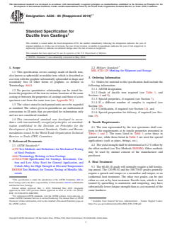 ABSTRACT This specification covers ductile iron castings, also known as spheroidal or nodular iron, that is described as cast iron with the graphite substantially spheroidal in shape and essentially free of other forms of graphite. Appropriate heat treatment shall be identified according to grades, as follows: a full ferritizing anneal for 60-40-18; a quench and temper, or normalize and temper, or isothermal heat treatment for 100-70-03 and 120-90-02; and as-cast for 65-45-12 and 80-55-06. Castings shall be tested and conform to specified tensile requirements such as tensile strength, yield strength, and elongation. When indicated in the contract or purchase order, castings shall also adhere to special requirements like hardness, chemical composition, microstructure, pressure tightness, radiographic soundness, magnetic particle inspection dimensions, and surface finish. SCOPE 1.1 This specification covers castings made of ductile iron, also known as spheroidal or nodular iron, which is described as cast iron with the graphite substantially spheroidal in shape and essentially free of other forms of graphite, as defined in Terminology A644. 1.2 No precise quantitative relationship can be stated between the properties of the iron in various locations of the same casting or between the properties of castings and those of a test specimen cast from the same iron (see Appendix X1). 1.3 The values stated in inch-pound units are to be regarded as standard. The values given in parentheses are mathematical conversions to SI units that are provided for information only and are not considered standard. 1.4 This international standard was developed in accordance with internationally recognized principles on standardization established in the Decision on Principles for the Development of International Standards, Guides and Recommendations issued by the World Trade Organization Technical Barriers to Trade (TBT) Committee.