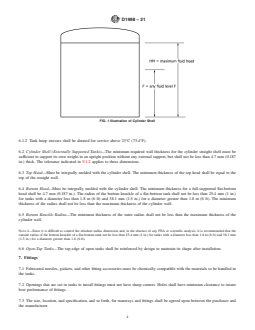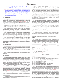 ABSTRACT This specification covers flat-bottom, upright, cylindrical tanks molded in one-piece seamless construction by rotational molding. The tanks are molded from polyethylene for above ground, vertical installation and are capable of containing aggressive chemicals at atmospheric pressure. This specification does not cover the design of vessels intended for use at pressures other than atmospheric pressure. Furthermore, this specification does not cover the design of portable tanks and is not for vessels intended for use with liquids heated above their flash points in continuous service. Special design considerations not covered in this specification shall be given to vessels subject to superimposed mechanical forces, such as seismic forces, wind load or agitation; to vessels subject to service above specified temperature; and vessels subject to specified superimposed pressure of water. Low-temperature impact test shall be performed on rotational-molded polyethylene tanks. The test method is used on tanks molded from both the crosslinked and non-crosslinked polyethylenes. Dart drop impact test shall be performed to determine the quality of the tank. O-xylene-insoluble fraction or gel test shall be performed on crosslinked polyethylene. Visual inspection and water test shall also be performed on the samples. SCOPE 1.1 This specification covers flat-bottom, upright, cylindrical tanks molded in one-piece seamless construction by rotational molding. The tanks are molded from polyethylene for above ground, vertical installation and are capable of containing aggressive chemicals at atmospheric pressure. Included are requirements for materials, properties, design, construction, dimensions, tolerances, workmanship and appearance. Tank capacities are from 1900 L (500 gal) up. 1.2 This specification covers the design of stationery vessels for use at atmospheric pressure intended for use with liquids heated below their flash points and continuous service temperatures below 66°C (150°F) for Type I tanks and below 60°C (140°F) for Type II tanks. 1.2.1 NFPA Standards 30 and NFPA 31 shall be consulted for installations that are subject to the requirements of these standards. 1.3 For service requirements beyond the scope of this specification (1.2), such as externally imposed mechanical forces, internal pressure or vacuum, higher temperature service, etc., other relevant sources of standards, for example, local and state building codes, NFPA, ASME, ARM, etc., shall be consulted. 1.4 The values stated in SI units are to be regarded as the standard. The values given in parentheses are for information only. Note 1: ISO 13341:2005+A1:2011 and ISO 13575:2012 are similar, but not equivalent to this standard. 1.5 The following precautionary caveat pertains only to the test methods portion, Section 11, of this specification: This standard does not purport to address all of the safety concerns, if any, associated with its use. It is the responsibility of the user of this standard to establish appropriate safety, health, and environmental practices and determine the applicability of regulatory limitations prior to use. 1.6 This international standard was developed in accordance with internationally recognized principles on standardization established in the Decision on Principles for the Development of International Standards, Guides and Recommendations issued by the World Trade Organization Technical Barriers to Trade (TBT) Committee.