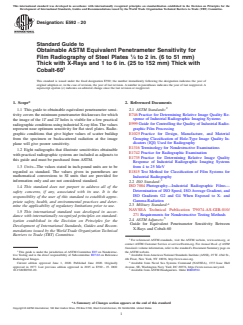 ASTM E592-20 is a guide published by ASTM International. Its full title is "Standard Guide to Obtainable ASTM Equivalent Penetrameter Sensitivity for Film Radiography of Steel Plates <fraction><num>1</num><den>4 </den> </fraction> to 2 in. (6 to 51 mm) Thick with X-Rays and 1 to 6 in. (25 to 152 mm) Thick with <brk/>Cobalt-60". This standard covers: SIGNIFICANCE AND USE 4.1 A key consideration with any radiographic system is its contrast resolution and spatial resolution capability (that is, sensitivity). The degree of obtainable sensitivity with a given system is dependent upon several radiographic parameters such as source energy level, film system class, type and thickness of intensifying screens, exposure (density), etc. This guide permits the user to estimate the degree of sensitivity that may be obtained with X-rays and Cobalt-60 gamma rays when using a prescribed set of radiographic parameters. This guide may also be used in conjunction with Practices E746 or E1735 to provide a basis for developing data for evaluation of a user's specific system. This data may assist a user in determining appropriate parameters for obtaining desired degrees of radiographic system sensitivity. An alternate to this approach is the use of those adjunct radiographic illustrations detailed in Section 6. SCOPE 1.1 This guide to obtainable equivalent penetrameter sensitivity covers the minimum penetrameter thicknesses for which the image of the 1T and 2T holes is visible for a few practical radiographic conditions using industrial X-ray film. The values represent near optimum sensitivity for flat steel plates. Radiographic conditions that give higher values of scatter buildup from the specimen or backscattered radiation at the image plane will give poorer sensitivity. 1.2 Eight radiographs that illustrate sensitivities obtainable with practical radiographic systems are included as adjuncts to this guide and must be purchased from ASTM. 1.3 Units—The values stated in inch-pound units are to be regarded as standard. The values given in parentheses are mathematical conversions to SI units that are provided for information only and are not considered standard. 1.4 This standard does not purport to address all of the safety concerns, if any, associated with its use. It is the responsibility of the user of this standard to establish appropriate safety, health, and environmental practices and determine the applicability of regulatory limitations prior to use. 1.5 This international standard was developed in accordance with internationally recognized principles on standardization established in the Decision on Principles for the Development of International Standards, Guides and Recommendations issued by the World Trade Organization Technical Barriers to Trade (TBT) Committee.