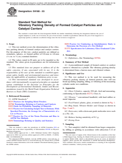 ASTM D4180-23 is a standard published by ASTM International. Its full title is "Standard Test Method for Vibratory Packing Density of Formed Catalyst Particles and Catalyst Carriers". This standard covers: SIGNIFICANCE AND USE 5.1 This test method is to be used for measuring the vibratory packing density of formed particles that will not break up during sampling, filling, or vibrating of the measuring cylinder under test conditions. SCOPE 1.1 This test method covers the determination of the vibratory packing density of formed catalyst and catalyst carriers. For the purpose of this test, catalyst particles are defined as extrudates, spheres, or formed pellets of 0.8-mm to 4.8-mm (1/32-in. to 3/16-in.) nominal diameter. 1.2 The values stated in SI units are to be regarded as the standard. The values given in parentheses are for information only. 1.3 This standard does not purport to address all of the safety concerns, if any, associated with its use. It is the responsibility of the user of this standard to establish appropriate safety, health, and environmental practices and determine the applicability of regulatory limitations prior to use. 1.4 This international standard was developed in accordance with internationally recognized principles on standardization established in the Decision on Principles for the Development of International Standards, Guides and Recommendations issued by the World Trade Organization Technical Barriers to Trade (TBT) Committee.