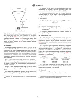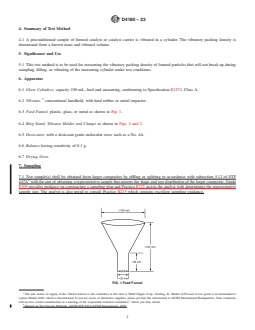 SIGNIFICANCE AND USE 5.1 This test method is to be used for measuring the vibratory packing density of formed particles that will not break up during sampling, filling, or vibrating of the measuring cylinder under test conditions. SCOPE 1.1 This test method covers the determination of the vibratory packing density of formed catalyst and catalyst carriers. For the purpose of this test, catalyst particles are defined as extrudates, spheres, or formed pellets of 0.8-mm to 4.8-mm (1/32-in. to 3/16-in.) nominal diameter. 1.2 The values stated in SI units are to be regarded as the standard. The values given in parentheses are for information only. 1.3 This standard does not purport to address all of the safety concerns, if any, associated with its use. It is the responsibility of the user of this standard to establish appropriate safety, health, and environmental practices and determine the applicability of regulatory limitations prior to use. 1.4 This international standard was developed in accordance with internationally recognized principles on standardization established in the Decision on Principles for the Development of International Standards, Guides and Recommendations issued by the World Trade Organization Technical Barriers to Trade (TBT) Committee.