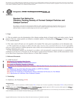 1.1 This test method covers the determination of the vibratory packing density of formed catalyst and catalyst carriers. For the purpose of this test, catalyst particles are defined as extrudates, spheres, or formed pellets of 0.8-mm to 4.8-mm (1/32-in. to 3/16-in.) nominal diameter.