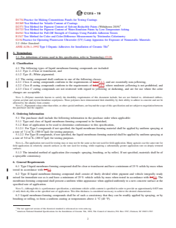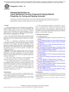 ASTM C1315-19 is a technical specification published by ASTM International. Its full title is "Standard Specification for Liquid Membrane-Forming Compounds Having Special Properties for Curing and Sealing Concrete". This standard covers: ABSTRACT This specification covers the performance requirements for membrane-forming liquids suitable for use as curing compounds and sealers for fresh and hardened concrete. Each membrane should have good alkali resistance, acid resistance, adhesion-promoting qualities, and resistance to degradation by UV light. The materials are limited to clear or translucent and white pigmented materials, all of which are classified into non-yellowing, moderately yellowing, or yellows or darkens unrestrictedly. SCOPE 1.1 This specification provides requirements for membrane-forming liquids suitable for use as curing compounds and sealers on freshly placed concrete and as sealers on hardened concrete. These membranes have special properties, such as, alkali resistance, acid resistance, adhesion-promoting qualities, and resistance to degradation by UV light. Note 1: For liquid membrane-forming curing compounds specified primarily by their ability to retain water in newly placed concrete (and by drying time, and for white pigmented products, reflectance), see Specification C309. 1.2 This is a performance specification. The allowable composition of products covered by this specification is limited by various local, regional, and national regulations. Issues related to air quality (solvent emission), worker exposure, and other hazards are not addressed here. It is the responsibility of the producers and users of these materials to comply with pertinent regulations. Warning—Some VOC exempt solvents used to meet the regulations are extremely flammable with low auto ignition temperatures and rapid evaporation rates. Consult the manufacturer's product information sheet for important application and safety information. 1.3 The values stated in SI units are to be regarded as the standard. (Inch pound units are shown in parentheses). 1.4 The following precautionary caveat pertains only to the test methods portion, Section 9, of this specification. This standard does not purport to address all of the safety concerns, if any, associated with its use. It is the responsibility of the user of this standard to establish appropriate safety, health, and environmental practices and determine the applicability of regulatory limitations prior to use. 1.5 This international standard was developed in accordance with internationally recognized principles on standardization established in the Decision on Principles for the Development of International Standards, Guides and Recommendations issued by the World Trade Organization Technical Barriers to Trade (TBT) Committee.
