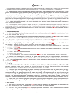 This specification covers the performance requirements for membrane-forming liquids suitable for use as curing compounds and sealers for fresh and hardened concrete. Each membrane should have good alkali resistance, acid resistance, adhesion-promoting qualities, and resistance to degradation by UV light. The materials are limited to clear or translucent and white pigmented materials, all of which are classified into non-yellowing, moderately yellowing, or yellows or darkens unrestrictedly.