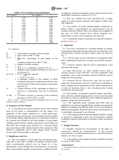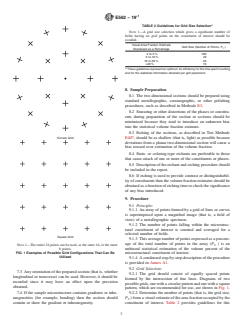 SIGNIFICANCE AND USE 5.1 This test method is based upon the stereological principle that a grid with a number of regularly arrayed points, when systematically placed over an image of a two-dimensional section through the microstructure, can provide, after a representative number of placements on different fields, an unbiased statistical estimation of the volume fraction of an identifiable constituent or phase (1, 2, 3).3 5.2 This test method has been described (4) as being superior to other manual methods with regard to effort, bias, and simplicity. 5.3 Any number of clearly distinguishable constituents or phases within a microstructure (or macrostructure) can be counted using the method. Thus, the method can be applied to any type of solid material from which adequate two-dimensional sections can be prepared and observed. 5.4 A condensed step-by-step guide for using the method is given in Annex A1. SCOPE 1.1 This test method describes a systematic manual point counting procedure for statistically estimating the volume fraction of an identifiable constituent or phase from sections through the microstructure by means of a point grid. 1.2 The use of automatic image analysis to determine the volume fraction of constituents is described in Practice E1245. 1.3 The values stated in SI units are to be regarded as standard. No other units of measurement are included in this standard. 1.4 This standard does not purport to address all of the safety concerns, if any, associated with its use. It is the responsibility of the user of this standard to establish appropriate safety, health, and environmental practices and determine the applicability of regulatory limitations prior to use. 1.5 This international standard was developed in accordance with internationally recognized principles on standardization established in the Decision on Principles for the Development of International Standards, Guides and Recommendations issued by the World Trade Organization Technical Barriers to Trade (TBT) Committee.