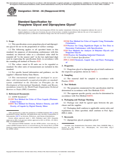 ASTM D5164-05(2019): Standard Specification for Propylene Glycol and Dipropylene Glycol provides clear quality and testing requirements for propylene glycol (PG) and dipropylene glycol (DPG) intended for use in the preparation of surface coatings. Developed by ASTM International, this standard supports manufacturers, formulators, and quality assurance teams by defining specific criteria for the properties, sampling, and conformity assessment of these glycols. This specification contributes to product consistency and compliance in global coatings industries by referencing internationally recognized testing and rounding-off practices.