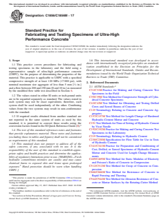 ASTM C1856/C1856M-17 is a standard published by ASTM International. Its full title is "Standard Practice for Fabricating and Testing Specimens of Ultra-High Performance Concrete". This standard covers: SIGNIFICANCE AND USE 4.1 This practice includes procedures for measuring properties of fresh UHPC and procedures for making and testing specimens of hardened UHPC. The practice refers to existing practices and test methods and includes modifications to these referenced standards for application to UHPC. SCOPE 1.1 This practice covers procedures for fabricating and testing specimens in the laboratory and the field using a representative sample of ultra-high performance concrete (UHPC), for the purpose of determining the properties of the material. This practice is applicable to UHPC with a specified compressive strength of at least 120 MPa (17 000 psi), with nominal maximum size aggregate of less than 5 mm [1/4 in.] and a flow between 200 and 250 mm [8 and 10 in.] as measured by the modified flow table test described in Section 6. 1.2 The values stated in either SI units or inch-pound units are to be regarded separately as standard. The values stated in each system may not be exact equivalents; therefore, each system shall be used independently of the other. Combining values from the two systems may result in non-conformance with the standard. 1.3 If required results obtained from another standard are not reported in the same system of units as used by this standard, it is permitted to convert those results using the conversion factors found in the SI Quick Reference Guide (1).2 1.4 The text of this standard references notes and footnotes that provide explanatory material. These notes and footnotes (excluding those in tables and figures) shall not be considered as requirements of this standard. 1.5 This standard does not purport to address all of the safety concerns, if any, associated with its use. It is the responsibility of the user of this standard to establish appropriate safety and health practices and determine the applicability of regulatory limitations prior to use. [WARNING—Fresh hydraulic cementitious mixtures are caustic and may cause chemical burns to exposed skin and tissue upon prolonged exposure.3 Hand protection should be worn when handling UHPC.] 1.6 This international standard was developed in accordance with internationally recognized principles on standardization established in the Decision on Principles for the Development of International Standards, Guides and Recommendations issued by the World Trade Organization Technical Barriers to Trade (TBT) Committee.