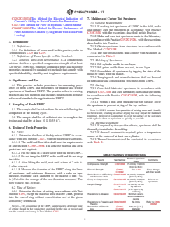SIGNIFICANCE AND USE 4.1 This practice includes procedures for measuring properties of fresh UHPC and procedures for making and testing specimens of hardened UHPC. The practice refers to existing practices and test methods and includes modifications to these referenced standards for application to UHPC. SCOPE 1.1 This practice covers procedures for fabricating and testing specimens in the laboratory and the field using a representative sample of ultra-high performance concrete (UHPC), for the purpose of determining the properties of the material. This practice is applicable to UHPC with a specified compressive strength of at least 120 MPa (17 000 psi), with nominal maximum size aggregate of less than 5 mm [1/4 in.] and a flow between 200 and 250 mm [8 and 10 in.] as measured by the modified flow table test described in Section 6. 1.2 The values stated in either SI units or inch-pound units are to be regarded separately as standard. The values stated in each system may not be exact equivalents; therefore, each system shall be used independently of the other. Combining values from the two systems may result in non-conformance with the standard. 1.3 If required results obtained from another standard are not reported in the same system of units as used by this standard, it is permitted to convert those results using the conversion factors found in the SI Quick Reference Guide (1).2 1.4 The text of this standard references notes and footnotes that provide explanatory material. These notes and footnotes (excluding those in tables and figures) shall not be considered as requirements of this standard. 1.5 This standard does not purport to address all of the safety concerns, if any, associated with its use. It is the responsibility of the user of this standard to establish appropriate safety and health practices and determine the applicability of regulatory limitations prior to use. [WARNING—Fresh hydraulic cementitious mixtures are caustic and may cause chemical burns to exposed skin and tissue upon prolonged exposure.3 Hand protection should be worn when handling UHPC.] 1.6 This international standard was developed in accordance with internationally recognized principles on standardization established in the Decision on Principles for the Development of International Standards, Guides and Recommendations issued by the World Trade Organization Technical Barriers to Trade (TBT) Committee.