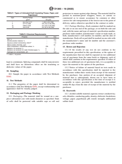 ASTM D1305-16(2022) is a technical specification published by ASTM International. Its full title is "Standard Specification for Electrical Insulating Paper and Paperboard-Sulfate (Kraft) Layer Type". This standard covers: ABSTRACT This specification covers electrically insulating, unbleached sulfate paper and paperboard used as layer insulation in coils, transformers, and other similar apparatus. The materials may also be used as turn insulation, slot liners, wedges, phase insulation, and separator papers in stranded wire/cable constructions. This specification does not include tissue for manufacture of capacitors. Other commonly used terms for the materials include soft coil wrap, dense coil wrap, kraft coil insulation, dry-finished kraft, and water-finished kraft. The materials covered in this specification are classified into four types according to density range and nominal thickness and should conform to the required values of ash content, alcohol-soluble material content, aqueous extract conductivity, water-soluble chloride content, fiber composition, moisture content, hydrogen ion concentration, pH, tensile strength, dielectric breakdown voltage, and conducting paths. SCOPE 1.1 This specification covers electrical grade unsized, unbleached sulfate paper and paperboard for use as layer insulation in coils, transformers, and similar apparatus. Other applications include, but are not limited to, turn insulation, slot liners, wedges, phase insulation, and separator papers in stranded wire/cable constructions. Tissue for the manufacture of capacitors is not included in this specification. Other commonly used designations include: 1.1.1 Soft Coil Wrap, 1.1.2 Dense Coil Wrap, 1.1.3 Kraft Coil Insulation, 1.1.4 Dry-Finished Kraft, and 1.1.5 Water-Finished Kraft. 1.2 The values stated in inch-pound units are to be regarded as standard. The values given in parentheses are mathematical conversions to SI units that are provided for information only and are not considered standard. 1.3 This international standard was developed in accordance with internationally recognized principles on standardization established in the Decision on Principles for the Development of International Standards, Guides and Recommendations issued by the World Trade Organization Technical Barriers to Trade (TBT) Committee.