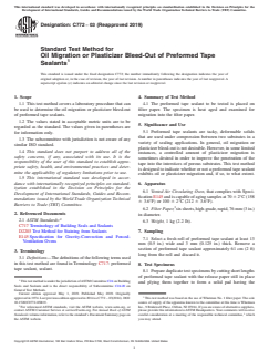 ASTM C772-03(2019) is a standard published by ASTM International. Its full title is "Standard Test Method for Oil Migration or Plasticizer Bleed-Out of Preformed Tape Sealants". This standard covers: SIGNIFICANCE AND USE 5.1 Preformed tape sealants are tacky, deformable solids that are used under compression between two substrates in a variety of sealing applications. In general, oil migration or plasticizer bleed-out is not desirable. However, in some limited instances, a controlled amount of plasticizer migration is sometimes desired in order to improve the penetration of the tape into the interstices of porous substrates. This test method is designed to indicate whether or not a preformed tape sealant exhibits oil or plasticizer migration and, if so, to what extent. SCOPE 1.1 This test method covers a laboratory procedure that can be used to determine the oil migration or plasticizer bleed-out of preformed tape sealants. 1.2 The values stated in acceptable metric units are to be regarded as the standard. The values given in parentheses are for information only. 1.3 The subcommittee with jurisdiction is not aware of any similar ISO standard. 1.4 This standard does not purport to address all of the safety concerns, if any, associated with its use. It is the responsibility of the user of this standard to establish appropriate safety, health, and environmental practices and determine the applicability of regulatory limitations prior to use. 1.5 This international standard was developed in accordance with internationally recognized principles on standardization established in the Decision on Principles for the Development of International Standards, Guides and Recommendations issued by the World Trade Organization Technical Barriers to Trade (TBT) Committee.