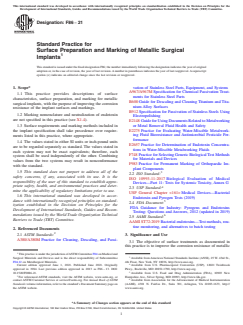 SIGNIFICANCE AND USE 3.1 The objective of surface treatments as documented in this practice is to improve the corrosion resistance of metallic surgical implants including, but not limited to, those manufactured from iron, cobalt, nickel, titanium, and tantalum base materials. 3.2 Iron particles, ceramic media, and other foreign particles may become smeared over or embedded into the surface of implants during processing operations such as forming, machining, tumbling, media blasting, marking, and so forth. These particles should be removed to minimize localized corrosion and superficial blemishes. 3.3 The various chemical and electrochemical surface treatments specified by this practice are used to remove objectionable surface contaminants and to restore maximum corrosion resistance to, or promote the creation of, an inert or passive surface, such as a metal oxide film, as is applicable to the specific material. Some of these treatments are referred to as passivation treatments. The preferred surface treatment for a given application varies depending on the implant material and the nature of the surface contaminants. 3.4 Depending on the implant, its material, and the type of marking method and procedure, the marking may be applied before or after a chemical or electrochemical surface treatment. When marking is performed after the surface treatment, the localized implant surface shall be evaluated to determine if there is a need for additional surface treatment. Note 1: The need for additional surface treatment is likely for stainless steel with all marking methods, and for nonferrous alloys when the marking method involves direct or second-hand contact with iron-based or other material that would be considered an objectionable surface contaminant. 3.5 The selection of procedures to be applied to the implants, and additional requirements which are not covered by this practice, may be included in the implant production specification. SCOPE 1.1 This practice provides descriptions of surface characteristics, surface preparation, and marking for metallic surgical implants, with the purpose of improving the corrosion resistance of the implant surfaces and markings. 1.2 Marking nomenclature and neutralization of endotoxin are not specified in this practice (see X1.4). 1.3 Surface requirements and marking methods included in the implant specification shall take precedence over requirements listed in this practice, where appropriate. 1.4 The values stated in either SI units or inch-pound units are to be regarded separately as standard. The values stated in each system may not be exact equivalents; therefore, each system shall be used independently of the other. Combining values from the two systems may result in nonconformance with the standard. 1.5 This standard does not purport to address all of the safety concerns, if any, associated with its use. It is the responsibility of the user of this standard to establish appropriate safety, health, and environmental practices and determine the applicability of regulatory limitations prior to use. 1.6 This international standard was developed in accordance with internationally recognized principles on standardization established in the Decision on Principles for the Development of International Standards, Guides and Recommendations issued by the World Trade Organization Technical Barriers to Trade (TBT) Committee.