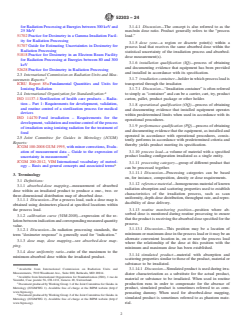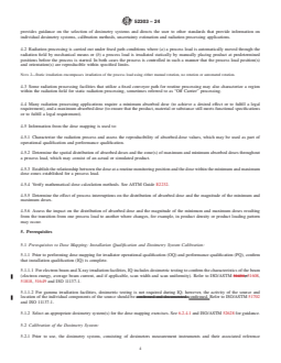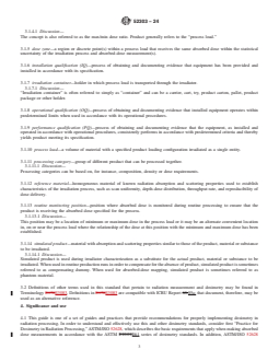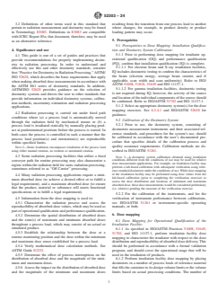 SIGNIFICANCE AND USE 4.1 This guide is one of a set of guides and practices that provide recommendations for properly implementing dosimetry in radiation processing. In order to understand and effectively use this and other dosimetry standards, consider first “Practice for Dosimetry in Radiation Processing,” ASTM/ISO 52628, which describes the basic requirements that apply when making absorbed dose measurements in accordance with the ASTM E61 series of dosimetry standards. In addition, ASTM/ISO 52628 provides guidance on the selection of dosimetry systems and directs the user to other standards that provide information on individual dosimetry systems, calibration methods, uncertainty estimation and radiation processing applications. 4.2 Radiation processing is carried out under fixed path conditions where (a) a process load is automatically moved through the radiation field by mechanical means or (b) a process load is irradiated statically by manually placing product at predetermined positions before the process is started. In both cases the process is controlled in such a manner that the process load position(s) and orientation(s) are reproducible within specified limits. Note 2: Static irradiation encompasses irradiation of the process load using either manual rotation, no rotation or automated rotation. 4.3 Some radiation processing facilities that utilize a fixed conveyor path for routine processing may also characterize a region within the radiation field for static radiation processing, sometimes referred to as “Off Carrier” processing. 4.4 Many radiation processing applications require a minimum absorbed dose (to achieve a desired effect or to fulfill a legal requirement), and a maximum absorbed dose (to ensure that the product, material or substance still meets functional specifications or to fulfill a legal requirement). 4.5 Information from the dose mapping is used to: 4.5.1 Characterize the radiation process and assess the reproducibility of absorbed-dose va... SCOPE 1.1 This document provides guidance in determining absorbed-dose distributions (mapping) in products, materials or substances irradiated in gamma, X-ray (bremsstrahlung) and electron beam facilities. Note 1: For irradiation of food and the radiation sterilization of health care products, specific ISO and ISO/ASTM standards containing dose mapping requirements exist. See ISO/ASTM Practices 51608, 51649, 51702 and 51818 and ISO 11137-1. Regarding the radiation sterilization of health care products, in those areas covered by ISO 11137-1, that standard takes precedence. 1.2 This guide is one of a set of standards that provides recommendations for properly implementing dosimetry in radiation processing. It is intended to be read in conjunction with ISO/ASTM 52628. 1.3 Methods of analyzing the dose map data are described. Examples are provided of statistical methods that may be used to analyze dose map data. 1.4 Dose mapping for bulk flow processing and fluid streams is not discussed. 1.5 Dosimetry is an element of a total quality management system for an irradiation facility. Other controls besides dosimetry may be required for specific applications such as medical device sterilization and food preservation. 1.6 This standard does not purport to address all of the safety concerns, if any, associated with its use. It is the responsibility of the user of this standard to establish appropriate safety, health, and environmental practices and determine the applicability of regulatory limitations prior to use. 1.7 This international standard was developed in accordance with internationally recognized principles on standardization established in the Decision on Principles for the Development of International Standards, Guides and Recommendations issued by the World Trade Organization Technical Barriers to Trade (TBT) Committee.