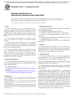 ASTM B415-16(2021) is a technical specification published by ASTM International. Its full title is "Standard Specification for Hard-Drawn Aluminum-Clad Steel Wire". This standard covers: ABSTRACT This specification covers four conductivities of bare, hard-drawn, round, aluminum-clad steel wire for general use for electrical purposes. The wire shall be composed of a steel core with a substantially uniform and continuous aluminum covering thoroughly bonded to it. The drawn wire shall have the properties and characteristics prescribed in the specification. The wire of varying nominal diameters shall conform to the prescribed tensile requirements such as tensile strength and elongation. The electrical resistance of the wire shall be determined by resistance measurements and maximum resistance shall be based on the nominal diameter of the wire and the resistivity value. The steel wire shall conform to the prescribed values of physical constants such as modulus of elasticity, coefficient of linear expansion, and temperature coefficient of resistance. Within a required range of diameters, the wire shall not vary from the specified diameter by more than the amount indicated. The aluminum thickness at any point shall not be less than the required values. The wire shall undergo a twist test, where the specimen shall be gripped at its ends in vises, one of which shall be free to move longitudinally during the test. The finished wire shall contain no joints or splices. The material shall also conform to the approximate properties of hard-drawn conductivity aluminum-clad steel wire. SCOPE 1.1 This specification covers four conductivities of bare, hard-drawn, round, aluminum-clad steel wire for general use for electrical purposes in sizes 0.2043 to 0.0808 in. incl (4 to 12 AWG) (Note 1). This specification does not apply to wires used as reinforcement in ACSR conductors. (See Specification B502.) Note 1: Wire ordered to this specification is not intended for redrawing. If wire is desired for this purpose, the manufacturer shall be consulted. 1.2 The values stated in inch-pound units are to be regarded as standard. The values given in parentheses are mathematical conversions to SI units that are provided for information only and are not considered standard. 1.3 This international standard was developed in accordance with internationally recognized principles on standardization established in the Decision on Principles for the Development of International Standards, Guides and Recommendations issued by the World Trade Organization Technical Barriers to Trade (TBT) Committee.