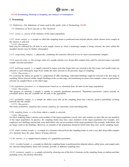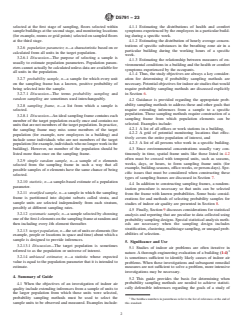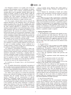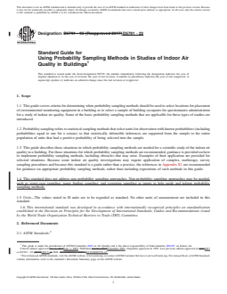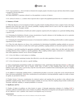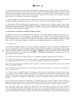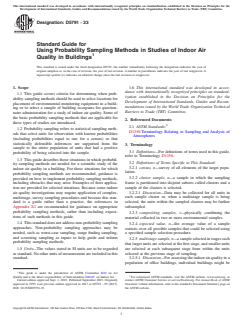 SIGNIFICANCE AND USE 5.1 Studies of indoor air problems are often iterative in nature. A thorough engineering evaluation of a building (1-4)3 is sometimes sufficient to identify likely causes of indoor air problems. When these investigations and subsequent remedial measures are not sufficient to solve a problem, more intensive investigations may be necessary. 5.2 This guide provides the basis for determining when probability sampling methods are needed to achieve statistically defensible inferences regarding the goals of a study of indoor air quality. The need for probability sampling methods in a study of indoor air quality depends on the specific objectives of the study. Such methods may be needed to select a sample of people to be asked questions, examined medically, or monitored for personal exposures. They may also be needed to select a sample of locations in space and time to be monitored for environmental contaminants. 5.3 This guide identifies several potential obstacles to proper implementation of probability sampling methods in studies of indoor air quality in buildings and presents procedures that overcome those obstacles or at least minimize their impact. 5.4 Although this guide specifically addresses sampling people or locations across time within a building, it also provides important guidance for studying populations of buildings. The guidance in this document is fully applicable to sampling locations to determine environmental quality or sampling people to determine environmental effects within each building in the sample selected from a larger population of buildings. SCOPE 1.1 This guide covers criteria for determining when probability sampling methods should be used to select locations for placement of environmental monitoring equipment in a building or to select a sample of building occupants for questionnaire administration for a study of indoor air quality. Some of the basic probability sampling methods that are applicable for these types of studies are introduced. 1.2 Probability sampling refers to statistical sampling methods that select units for observation with known probabilities (including probabilities equal to one for a census) so that statistically defensible inferences are supported from the sample to the entire population of units that had a positive probability of being selected into the sample. 1.3 This guide describes those situations in which probability sampling methods are needed for a scientific study of the indoor air quality in a building. For those situations for which probability sampling methods are recommended, guidance is provided on how to implement probability sampling methods, including obstacles that may arise. Examples of their application are provided for selected situations. Because some indoor air quality investigations may require application of complex, multistage, survey sampling procedures and because this standard is a guide rather than a practice, the references in Appendix X1 are recommended for guidance on appropriate probability sampling methods, rather than including expositions of such methods in this guide. 1.4 This standard does not address non-probability sampling approaches. Non-probability sampling approaches may be needed, such as worst-case sampling, range finding sampling, and screening sampling as inputs to help guide and inform probability sampling methods. 1.5 Units—The values stated in SI units are to be regarded as standard. No other units of measurement are included in this standard. 1.6 This international standard was developed in accordance with internationally recognized principles on standardization established in the Decision on Principles for the Development of International Standards, Guides and Recommendations issued by the World Trade Organization Technical Barriers to Trade (TBT) Committee.