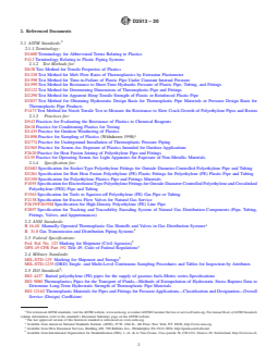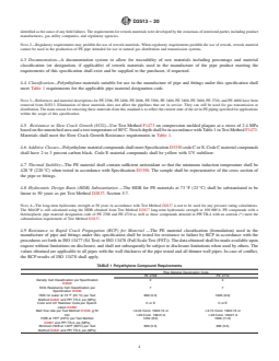 ASTM D2513-20 is a technical specification published by ASTM International. Its full title is "Standard Specification for Polyethylene (PE) Gas Pressure Pipe, Tubing, and Fittings". This standard covers: ABSTRACT This specification covers the requirements and test methods for material, dimensions, hydrostatic burst strength, tensile strength, chemical resistance, sustained pressure, heat fusion, and impact resistance of plastic pipes, tubing, and fittings used for direct burial and reliner applications in fuel gas mains and services for the distribution of natural gas. This specification does not cover threaded pipe. The plastic used to make the pipes and fittings shall be virgin plastic or reworked plastic having Plastics Pipe Institute (PPI) long-term hydrostatic design stress and hydrostatic design basis rating. SCOPE 1.1 This specification covers requirements and test methods for material dimensions and tolerances, hydrostatic burst strength, chemical resistance, and rapid crack resistance of polyethylene pipe, tubing, and fittings for use in fuel gas pipelines for direct burial and reliner applications. The pipe and fittings covered by this specification are intended for use in the transmission and distribution of natural gas. Requirements for the qualifying of polyethylene systems for use with liquefied petroleum gas are also covered. 1.1.1 This specification does not cover threaded pipe. Design considerations are discussed in Appendix X1. In-plant quality control programs are specified in Annex A1 and Annex A2. 1.1.2 See Specification F2619/F2619M for polyethylene piping for pressure or non-pressure oil and gas producing applications to convey fluids such as oil, dry or wet gas, multiphase fluids, and non-potable oilfield water. 1.2 The text of this specification references notes, footnotes, and appendixes which provide explanatory material. These notes and footnotes (excluding those in tables and figures) shall not be considered as requirements of the specification. 1.3 The values stated in inch-pound units are to be regarded as standard. The values given in parentheses are mathematical conversions to SI units that are provided for information only and are not considered standard. 1.4 The following is an index of the annexes and appendix in this specification: Annex Subject Annex A1 In-Plant Quality Control for all materials up to 12 in. Annex A2 In-Plant Quality Control for PE materials 14 in. and larger. Appendixes Subject Appendix X1 Design Consideration 1.5 The following precautionary caveat pertains only to the test method portion, Section 6, of this specification. This standard does not purport to address all of the safety concerns, if any, associated with its use. It is the responsibility of the user of this standard to establish appropriate safety, health, and environmental practices and determine the applicability of regulatory limitations prior to use. 1.6 This international standard was developed in accordance with internationally recognized principles on standardization established in the Decision on Principles for the Development of International Standards, Guides and Recommendations issued by the World Trade Organization Technical Barriers to Trade (TBT) Committee.