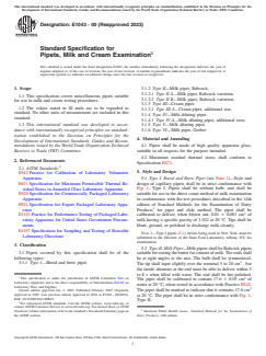 ABSTRACT This specification covers miscellaneous pipets suitable for use in milk and cream testing procedures. Pipets shall be made of high quality apparatus glass. Pipets shall be of the following types: Type 1—breed and brew pipet; Type II—milk pipet, Babcock; Type II A—milk pipet, Babcock variation; Type II B—milk pipet, Babcock variation; Type III—cream pipet; Type III A—cream pipet, additional size; Type IV—milk diluting pipet; Type IV A—milk diluting pipet, additional sizes; Type V—milk diluting pipet; Type VI—milk pipet, Gerber. Materials shall be tested and the individual grades shall conform to specified values of style and design, markings, and maximum residual thermal stress. SCOPE 1.1 This specification covers miscellaneous pipets suitable for use in milk and cream testing procedures. 1.2 The values stated in SI units are to be regarded as standard. No other units of measurement are included in this standard. 1.3 This international standard was developed in accordance with internationally recognized principles on standardization established in the Decision on Principles for the Development of International Standards, Guides and Recommendations issued by the World Trade Organization Technical Barriers to Trade (TBT) Committee.