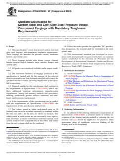ASTM A765/A765M-07(2022) is a technical specification published by ASTM International. Its full title is "Standard Specification for Carbon Steel and Low-Alloy Steel Pressure-Vessel-Component Forgings with Mandatory Toughness Requirements". This standard covers: ABSTRACT This specification covers heat-treated carbon steel and alloy steel forgings with mandatory toughness requirements. These forgings include tube sheets, covers, channel barrels, integral forged channels, rings, nozzles, flanges, and similar parts. The maximum thickness of forgings produced to this specification is limited only by the capacity of the selected grade to respond to any heat treatment specified and to meet the specified mechanical tests, including impact tests at the specified temperature. Heat treatment shall consist of one of the following treatment options: normalize and temper; double normalize, wherein the second austenitizing temperature is at the same or lower temperature than the first, followed by tempering; quench and temper, with the option of adding a preliminary normalize before austenitizing for quenching in a suitable liquid medium. The forgings shall be subjected to tension and Charpy V-notch impact tests. SCOPE 1.1 This specification2 covers heat-treated carbon steel and alloy steel forgings with mandatory toughness requirements. These forgings are intended for pressure vessels, feedwater heaters, and similar uses. 1.2 These forgings include tube sheets, covers, channel barrels, integral forged channels, rings, nozzles, flanges, and similar parts. 1.3 All grades are considered weldable under proper conditions. 1.4 The maximum thickness of forgings produced to this specification is limited only by the capacity of the selected grade to respond to any heat treatment specified and to meet the specified mechanical tests, including impact tests at the specified temperature. 1.5 Material supplied to this specification shall conform to the requirements of Specification A788/A788M, which outlines additional ordering information, manufacturing requirements, testing and retesting methods and procedures, marking, certification, product analysis variations, and additional supplementary requirements. 1.6 If the requirements of this specification are in conflict with the requirements of Specification A788/A788M, the requirements of this specification shall prevail. 1.7 The values stated in either inch-pound units or SI [metric] units are to be regarded separately as standard; within the text and tables, the SI units are shown in brackets. The values stated in each system are not necessarily exact equivalents; therefore, to ensure conformance with the standard, each system shall be used independently of the other, and values from the two systems shall not be combined. 1.8 Unless the order specifies the applicable “M” specification designation, the material shall be furnished to the inch-pound units. 1.9 This international standard was developed in accordance with internationally recognized principles on standardization established in the Decision on Principles for the Development of International Standards, Guides and Recommendations issued by the World Trade Organization Technical Barriers to Trade (TBT) Committee.