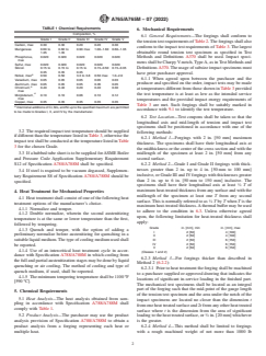 ABSTRACT This specification covers heat-treated carbon steel and alloy steel forgings with mandatory toughness requirements. These forgings include tube sheets, covers, channel barrels, integral forged channels, rings, nozzles, flanges, and similar parts. The maximum thickness of forgings produced to this specification is limited only by the capacity of the selected grade to respond to any heat treatment specified and to meet the specified mechanical tests, including impact tests at the specified temperature. Heat treatment shall consist of one of the following treatment options: normalize and temper; double normalize, wherein the second austenitizing temperature is at the same or lower temperature than the first, followed by tempering; quench and temper, with the option of adding a preliminary normalize before austenitizing for quenching in a suitable liquid medium. The forgings shall be subjected to tension and Charpy V-notch impact tests. SCOPE 1.1 This specification2 covers heat-treated carbon steel and alloy steel forgings with mandatory toughness requirements. These forgings are intended for pressure vessels, feedwater heaters, and similar uses. 1.2 These forgings include tube sheets, covers, channel barrels, integral forged channels, rings, nozzles, flanges, and similar parts. 1.3 All grades are considered weldable under proper conditions. 1.4 The maximum thickness of forgings produced to this specification is limited only by the capacity of the selected grade to respond to any heat treatment specified and to meet the specified mechanical tests, including impact tests at the specified temperature. 1.5 Material supplied to this specification shall conform to the requirements of Specification A788/A788M, which outlines additional ordering information, manufacturing requirements, testing and retesting methods and procedures, marking, certification, product analysis variations, and additional supplementary requirements. 1.6 If the requirements of this specification are in conflict with the requirements of Specification A788/A788M, the requirements of this specification shall prevail. 1.7 The values stated in either inch-pound units or SI [metric] units are to be regarded separately as standard; within the text and tables, the SI units are shown in brackets. The values stated in each system are not necessarily exact equivalents; therefore, to ensure conformance with the standard, each system shall be used independently of the other, and values from the two systems shall not be combined. 1.8 Unless the order specifies the applicable “M” specification designation, the material shall be furnished to the inch-pound units. 1.9 This international standard was developed in accordance with internationally recognized principles on standardization established in the Decision on Principles for the Development of International Standards, Guides and Recommendations issued by the World Trade Organization Technical Barriers to Trade (TBT) Committee.