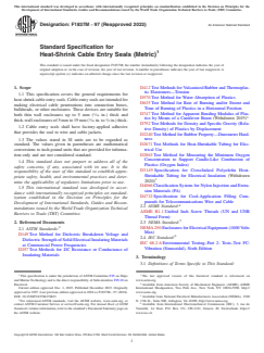 ASTM F1837M-97(2023), Standard Specification for Heat-Shrink Cable Entry Seals (Metric), defines general requirements for heat-shrink cable entry seals used in electrical cable penetrations into connection boxes, bulkheads, or other enclosures. This international standard provides guidance on the application, material composition, and testing of cable entry seals to ensure reliable electrical insulation and environmental protection. ASTM F1837M covers a wide range of seal types and sizes, suitable for both thin and thick-walled enclosures, and supports global trade and equipment interoperability through metric dimensions and internationally recognized testing methods.