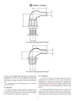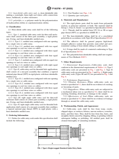 ABSTRACT This specification covers the general requirements for heat-shrink cable entry seals. Cable entry seals are intended for making electrical cable penetrations into connection boxes, bulkheads, or other enclosures. Heat-shrink cable entry seals shall be of the following types: Type I (Types I-1, I-2, I-3, I-4, I-5, and I-6); Type II (Types II-1, II-2, II-3, and II-4); Type III; and Type IV. The rigid plastic parts shall be made from polyamide (nylon), or polyester material, or both. The following tests shall be performed: conformance testing; mechanical abuse test; and level of effectiveness. SCOPE 1.1 This specification covers the general requirements for heat-shrink cable entry seals. Cable entry seals are intended for making electrical cable penetrations into connection boxes, bulkheads, or other enclosures. These devices are suitable for both thin wall enclosures up to 5 mm (3/16 in.) thick and thick-wall enclosures of 5 mm to 19 mm (3/16 in. to 3/4 in.) thick. 1.2 Cable entry seals shall have factory-applied adhesive that provides the seal to wire and cable jackets. 1.3 The values stated in SI units are to be regarded as standard. The values given in parentheses are mathematical conversions to inch-pound units that are provided for information only and are not considered standard. 1.4 This standard does not purport to address all of the safety concerns, if any, associated with its use. It is the responsibility of the user of this standard to establish appropriate safety, health, and environmental practices and determine the applicability of regulatory limitations prior to use. 1.5 This international standard was developed in accordance with internationally recognized principles on standardization established in the Decision on Principles for the Development of International Standards, Guides and Recommendations issued by the World Trade Organization Technical Barriers to Trade (TBT) Committee.