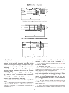 ASTM F1837M-97(2023) is a technical specification published by ASTM International. Its full title is "Standard Specification for Heat-Shrink Cable Entry Seals (Metric)". This standard covers: ABSTRACT This specification covers the general requirements for heat-shrink cable entry seals. Cable entry seals are intended for making electrical cable penetrations into connection boxes, bulkheads, or other enclosures. Heat-shrink cable entry seals shall be of the following types: Type I (Types I-1, I-2, I-3, I-4, I-5, and I-6); Type II (Types II-1, II-2, II-3, and II-4); Type III; and Type IV. The rigid plastic parts shall be made from polyamide (nylon), or polyester material, or both. The following tests shall be performed: conformance testing; mechanical abuse test; and level of effectiveness. SCOPE 1.1 This specification covers the general requirements for heat-shrink cable entry seals. Cable entry seals are intended for making electrical cable penetrations into connection boxes, bulkheads, or other enclosures. These devices are suitable for both thin wall enclosures up to 5 mm (3/16 in.) thick and thick-wall enclosures of 5 mm to 19 mm (3/16 in. to 3/4 in.) thick. 1.2 Cable entry seals shall have factory-applied adhesive that provides the seal to wire and cable jackets. 1.3 The values stated in SI units are to be regarded as standard. The values given in parentheses are mathematical conversions to inch-pound units that are provided for information only and are not considered standard. 1.4 This standard does not purport to address all of the safety concerns, if any, associated with its use. It is the responsibility of the user of this standard to establish appropriate safety, health, and environmental practices and determine the applicability of regulatory limitations prior to use. 1.5 This international standard was developed in accordance with internationally recognized principles on standardization established in the Decision on Principles for the Development of International Standards, Guides and Recommendations issued by the World Trade Organization Technical Barriers to Trade (TBT) Committee.