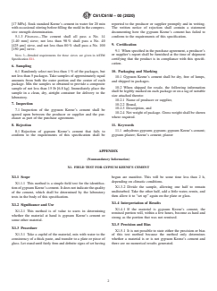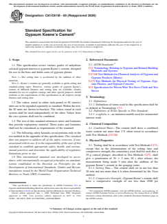 ABSTRACT This specification covers various grades of anhydrous calcined gypsum known as gypsum Keene's cement, designed for use in the base and finish coats of gypsum plaster. The cement shall show a combined water content not more than the specified value when tested in accordance with the referenced test method. The cement shall conform to the required physical properties and shall undergo tests on setting time, compressive strength, and fineness. SCOPE 1.1 This specification covers various grades of anhydrous calcined gypsum known as gypsum Keene's cement, designed for use in the base and finish coats of gypsum plaster. Note 1: The setting time is accelerated by the addition of other materials. Note 2: Keene's cements are generally available as quick-setting and standard-setting types. However, various grades of gypsum Keene's cement of different fineness and setting time are available. Grades intended for use in scagliola castings and other special purposes should conform to the requirements of this specification in all respects except fineness and setting time. 1.2 The values stated in either inch-pound or SI (metric) units are to be regarded separately as standard. Within the text, the SI units are shown in brackets. The values stated in each system shall be used independently of the other. Values from the two systems shall not be combined. 1.3 The text of this standard references notes and footnotes that provide explanatory material. These notes and footnotes shall not be considered as requirements of the standard. 1.4 The following safety hazards caveat pertains only to the test method in the appendix of this specification: This standard does not purport to address all of the safety concerns, if any, associated with its use. It is the responsibility of the user of this standard to establish appropriate safety, health, and environmental practices and determine the applicability of regulatory limitations prior to use. 1.5 This international standard was developed in accordance with internationally recognized principles on standardization established in the Decision on Principles for the Development of International Standards, Guides and Recommendations issued by the World Trade Organization Technical Barriers to Trade (TBT) Committee.