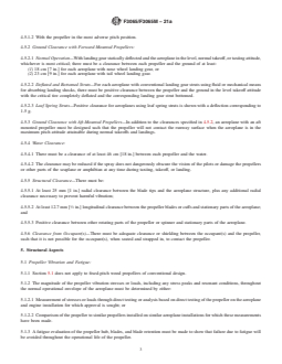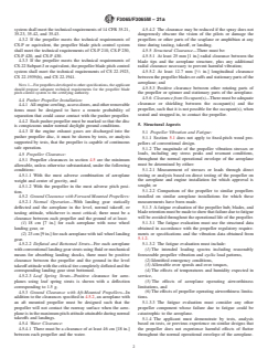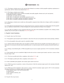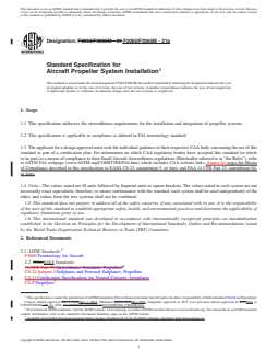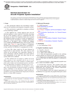ABSTRACT This specification covers airworthiness requirements for the installation and integration of propeller systems, and is applicable to aeroplanes as defined in F44 terminology standard. The applicant for a design approval must seek the individual guidance to their respective civil aviation authority (CAA) body concerning the use of this specification as part of a certification plan. The requirements prescribed in this specification cover: propeller installation aspects (general propeller, feathering propellers, variable-pitch propellers, pusher propeller installation, propeller clearance), structural aspects (propeller vibration and fatigue), propeller control limitations (propeller speed and pitch limits, propeller reversing systems), and associated propeller systems (oil system-propeller feathering systems, turbopropeller-drag limiting systems). SCOPE 1.1 This specification addresses the airworthiness requirements for the installation and integration of propeller systems. 1.2 This specification is applicable to aeroplanes as defined in F44 terminology standard. 1.3 The applicant for a design approval must seek the individual guidance to their respective CAA body concerning the use of this standard as part of a certification plan. For information on which CAA regulatory bodies have accepted this standard (in whole or in part) as a means of compliance to their Small Aircraft Airworthiness regulations (Hereinafter referred to as “the Rules”), refer to ASTM F44 webpage (www.ASTM.org/COMITTEE/F44.htm) which includes CAA website links. Annex A1 maps the Means of Compliance described in this specification to EASA CS-23, amendment 5, or later, and FAA 14 CFR Part 23, amendment 64, or later. 1.4 Units—The values stated are SI units followed by Imperial units in square brackets. The values stated in each system are not necessarily exact equivalents; therefore, to ensure conformance with the standard, each system shall be used independently of the other, and values from the two systems shall not be combined. 1.5 This standard does not purport to address all of the safety concerns, if any, associated with its use. It is the responsibility of the user of this standard to establish appropriate safety, health, and environmental practices and determine the applicability of regulatory limitations prior to use. 1.6 This international standard was developed in accordance with internationally recognized principles on standardization established in the Decision on Principles for the Development of International Standards, Guides and Recommendations issued by the World Trade Organization Technical Barriers to Trade (TBT) Committee.