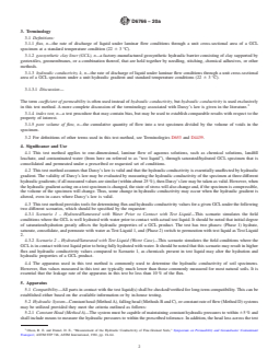 SIGNIFICANCE AND USE 4.1 This test method applies to one-dimensional, laminar flow of aqueous solutions, such as chemical solutions, landfill leachate, and contaminated water (from here on referred to as “test liquid”), through saturated/hydrated GCL specimen that is consolidated and permeated under a prescribed or requested set of conditions. 4.2 This test method assumes that Darcy’s law is valid and that the hydraulic conductivity is essentially unaffected by hydraulic gradient. The validity of Darcy’s law may be evaluated by measuring the hydraulic conductivity of the specimen at three different hydraulic gradients; if all measured values are similar (within about 25 %), then Darcy's law may be taken as valid. However, when the hydraulic gradient acting on a test specimen is changed, the state of stress will also change and, if the specimen is compressible, the volume of the specimen will change. Thus, some change in hydraulic conductivity may occur when the hydraulic gradient is altered, even in cases where Darcy's law is valid. 4.3 This test method provides tools for determining flux and hydraulic conductivity values for a given GCL under the following two different scenarios, which should be specified by the requester: 4.3.1 Scenario 1 – Hydrated/Saturated with Water Prior to Contact with Test Liquid—This scenario simulates the field conditions where the GCL is well hydrated with water prior to contact with actual test liquid. It should be noted that initial degree of saturation/hydration greatly affects the hydraulic properties of a GCL product. The test has two phases: (Phase 1) hydrate, saturate, consolidate, and permeate with water as Test Liquid 1, and (Phase 2) switch to permeation with test liquid as Test Liquid 2. 4.3.2 Scenario 2 – Hydrated/Saturated with Test Liquid (Worst Case)—This scenario simulates the field conditions where the GCL is in contact with test liquid prior to being fully hydrated with water. It should be noted that this scenario may result in... SCOPE 1.1 This test method covers laboratory measurement of both flux and hydraulic conductivity (also referred to as coefficient of permeability) of geosynthetic clay liner (GCL) specimens permeated with chemical solutions and leachates utilizing a flexible wall permeameter. For test measurement of index hydraulic properties of geosynthetic clay liners, refer to Test Method D5887/D5887M. For hydraulic conductivity compatibility of soils with aqueous chemical solutions and leachates, refer to Test Method D7100. 1.2 This test method may be utilized with GCL specimens that have a hydraulic conductivity less than or equal to 1 × 10–5 m/s (1 × 10–3 cm/s). 1.3 This test method is applicable to GCL products having geotextile backing(s). It is not applicable to GCL products with geomembrane backing(s), geofilm backing(s), or polymer coating backing(s). 1.4 This test method allows the requester to evaluate the hydraulic properties of a GCL with site-specific or laboratory-prepared solution under different test conditions; thus, the test method also may be used to check performance or conformance, or both. 1.5 The values stated in SI units are to be regarded as the standard, unless other units are specifically given. By tradition in U.S. practice, hydraulic conductivity is reported in centimeters per second, although the common SI units for hydraulic conductivity are meters per second. 1.6 This standard does not purport to address all of the safety concerns, if any, associated with its use. It is the responsibility of the user of this standard to establish appropriate safety, health, and environmental practices and determine the applicability of regulatory limitations prior to use. 1.7 This international standard was developed in accordance with internationally recognized principles on standardization established in the Decision on Principles for the Development of International Standards, Guides and Recommendations i...