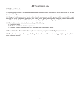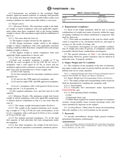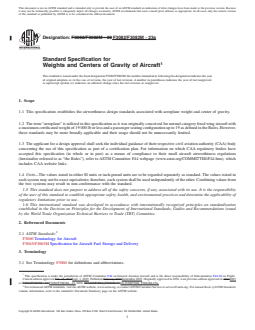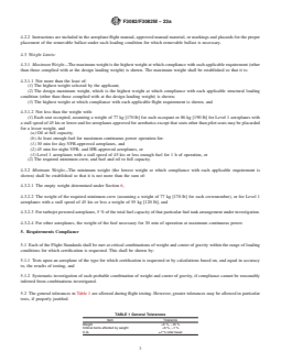 ABSTRACT This specification covers airworthiness design standards associated with aeroplane flight. The applicant for a design approval shall seek the individual guidance of their respective civil aviation authority (CAA) body concerning the use of this specification as part of a certification plan. SCOPE 1.1 This specification establishes the airworthiness design standards associated with aeroplane weight and center of gravity. 1.2 The term “aeroplane” is utilized in this specification as it was originally conceived for normal category fixed wing aircraft with a maximum certificated weight of 19 000 lb or less and a passenger seating configuration up to 19 as defined in the Rules. However, these standards may be more broadly applicable and their usage should not be unnecessarily limited. 1.3 The applicant for a design approval shall seek the individual guidance of their respective civil aviation authority (CAA) body concerning the use of this specification as part of a certification plan. For information on which CAA regulatory bodies have accepted this specification (in whole or in part) as a means of compliance to their small aircraft airworthiness regulations (hereinafter referred to as “the Rules”), refer to ASTM Committee F44 webpage (www.astm.org/COMMITTEE/F44.htm), which includes CAA website links. 1.4 Units—The values stated in either SI units or inch-pound units are to be regarded separately as standard. The values stated in each system may not be exact equivalents; therefore, each system shall be used independently of the other. Combining values from the two systems may result in non-conformance with the standard. 1.5 This standard does not purport to address all of the safety concerns, if any, associated with its use. It is the responsibility of the user of this standard to establish appropriate safety, health, and environmental practices and determine the applicability of regulatory limitations prior to use. 1.6 This international standard was developed in accordance with internationally recognized principles on standardization established in the Decision on Principles for the Development of International Standards, Guides and Recommendations issued by the World Trade Organization Technical Barriers to Trade (TBT) Committee.