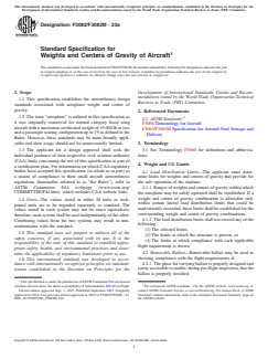 ASTM F3082/F3082M-23a is a technical specification published by ASTM International. Its full title is "Standard Specification for Weights and Centers of Gravity of Aircraft". This standard covers: ABSTRACT This specification covers airworthiness design standards associated with aeroplane flight. The applicant for a design approval shall seek the individual guidance of their respective civil aviation authority (CAA) body concerning the use of this specification as part of a certification plan. SCOPE 1.1 This specification establishes the airworthiness design standards associated with aeroplane weight and center of gravity. 1.2 The term “aeroplane” is utilized in this specification as it was originally conceived for normal category fixed wing aircraft with a maximum certificated weight of 19 000 lb or less and a passenger seating configuration up to 19 as defined in the Rules. However, these standards may be more broadly applicable and their usage should not be unnecessarily limited. 1.3 The applicant for a design approval shall seek the individual guidance of their respective civil aviation authority (CAA) body concerning the use of this specification as part of a certification plan. For information on which CAA regulatory bodies have accepted this specification (in whole or in part) as a means of compliance to their small aircraft airworthiness regulations (hereinafter referred to as “the Rules”), refer to ASTM Committee F44 webpage (www.astm.org/COMMITTEE/F44.htm), which includes CAA website links. 1.4 Units—The values stated in either SI units or inch-pound units are to be regarded separately as standard. The values stated in each system may not be exact equivalents; therefore, each system shall be used independently of the other. Combining values from the two systems may result in non-conformance with the standard. 1.5 This standard does not purport to address all of the safety concerns, if any, associated with its use. It is the responsibility of the user of this standard to establish appropriate safety, health, and environmental practices and determine the applicability of regulatory limitations prior to use. 1.6 This international standard was developed in accordance with internationally recognized principles on standardization established in the Decision on Principles for the Development of International Standards, Guides and Recommendations issued by the World Trade Organization Technical Barriers to Trade (TBT) Committee.