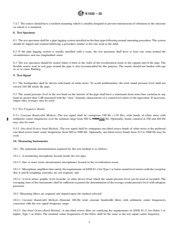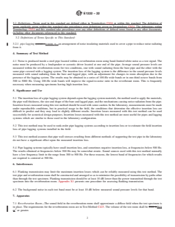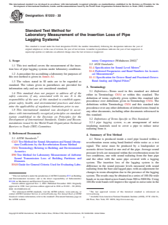 ASTM E1222-22 is a standard published by ASTM International. Its full title is "Standard Test Method for Laboratory Measurement of the Insertion Loss of Pipe Lagging Systems". This standard covers: SIGNIFICANCE AND USE 5.1 The insertion loss of a pipe lagging system depends upon the lagging system materials, the method used to apply the materials, the pipe wall thickness, the size and shape of the bare and lagged pipe, and the mechanisms causing noise radiation from the pipe. Insertion losses measured using this test method should be used with some caution. In the laboratory, measurements must be made under reproducible conditions, but in practical usage in the field, the conditions that determine the effective insertion loss are difficult to predict and they may lead to slightly different results. Insertion losses measured with this test method can be used successfully for acoustical design purposes. Insertion losses measured with this test method are most useful for pipes and lagging systems which are similar to those used in the laboratory configuration. 5.2 This test method may be used to rank-order pipe lagging systems according to insertion loss or to estimate the field insertion loss of pipe lagging systems installed in the field. 5.3 This test method assumes that pipe wall stresses resulting from different methods of supporting the test pipe in the laboratory do not have a significant effect upon the measured insertion loss. 5.4 Pipe lagging systems typically have small insertion loss, and sometimes negative insertion loss, at frequencies below 500 Hz. The results obtained at frequencies below 500 Hz may be somewhat erratic. Sound sources used with this test method normally have a low frequency limit in the range from 300 to 500 Hz. For these reasons, the lowest band of frequencies for which results are required is centered at 500 Hz. SCOPE 1.1 This test method covers the measurement of the insertion loss of pipe lagging systems under laboratory conditions. 1.2 A procedure for accrediting a laboratory for purposes of this test method is given in Annex A1. 1.3 The values stated in SI units are to be regarded as standard. The values given in parentheses are provided for information only and are not considered standard. 1.4 This standard does not purport to address all of the safety concerns, if any, associated with its use. It is the responsibility of the user of this standard to establish appropriate safety, health, and environmental practices and determine the applicability of regulatory limitations prior to use. 1.5 This international standard was developed in accordance with internationally recognized principles on standardization established in the Decision on Principles for the Development of International Standards, Guides and Recommendations issued by the World Trade Organization Technical Barriers to Trade (TBT) Committee.
