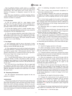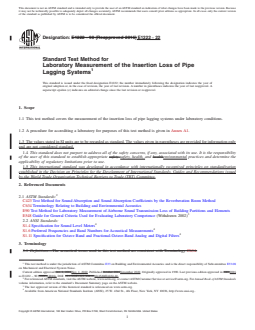 SIGNIFICANCE AND USE 5.1 The insertion loss of a pipe lagging system depends upon the lagging system materials, the method used to apply the materials, the pipe wall thickness, the size and shape of the bare and lagged pipe, and the mechanisms causing noise radiation from the pipe. Insertion losses measured using this test method should be used with some caution. In the laboratory, measurements must be made under reproducible conditions, but in practical usage in the field, the conditions that determine the effective insertion loss are difficult to predict and they may lead to slightly different results. Insertion losses measured with this test method can be used successfully for acoustical design purposes. Insertion losses measured with this test method are most useful for pipes and lagging systems which are similar to those used in the laboratory configuration. 5.2 This test method may be used to rank-order pipe lagging systems according to insertion loss or to estimate the field insertion loss of pipe lagging systems installed in the field. 5.3 This test method assumes that pipe wall stresses resulting from different methods of supporting the test pipe in the laboratory do not have a significant effect upon the measured insertion loss. 5.4 Pipe lagging systems typically have small insertion loss, and sometimes negative insertion loss, at frequencies below 500 Hz. The results obtained at frequencies below 500 Hz may be somewhat erratic. Sound sources used with this test method normally have a low frequency limit in the range from 300 to 500 Hz. For these reasons, the lowest band of frequencies for which results are required is centered at 500 Hz. SCOPE 1.1 This test method covers the measurement of the insertion loss of pipe lagging systems under laboratory conditions. 1.2 A procedure for accrediting a laboratory for purposes of this test method is given in Annex A1. 1.3 The values stated in SI units are to be regarded as standard. The values given in parentheses are provided for information only and are not considered standard. 1.4 This standard does not purport to address all of the safety concerns, if any, associated with its use. It is the responsibility of the user of this standard to establish appropriate safety, health, and environmental practices and determine the applicability of regulatory limitations prior to use. 1.5 This international standard was developed in accordance with internationally recognized principles on standardization established in the Decision on Principles for the Development of International Standards, Guides and Recommendations issued by the World Trade Organization Technical Barriers to Trade (TBT) Committee.