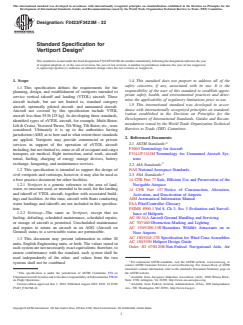 ASTM F3423/F3423M-22 is a technical specification published by ASTM International. Its full title is "Standard Specification for Vertiport Design". This standard covers: SCOPE 1.1 This specification defines the requirements for the planning, design, and establishment of vertiports intended to service vertical takeoff and landing (VTOL) aircraft. These aircraft include, but are not limited to, standard category aircraft, optionally piloted aircraft, and unmanned aircraft. Aircraft not covered by this specification include VTOL aircraft less than 55 lb [25 kg]. In developing these standards, identified types of eVTOL aircraft, for example, Multi-Rotor, Lift & Cruise, Vectored Thrust, Tilt Wing, Tilt Rotor, etc., were considered. Ultimately it is up to the authorities having jurisdiction (AHJ) as to how and to what extent these standards are applied. Vertiports may provide commercial or private services in support of the operation of eVTOL aircraft including, but not limited to, some or all of occupant and cargo transport, air medical, flight instruction, aerial work, aircraft rental, fueling, charging of energy storage devices, battery exchange, hangaring, and maintenance services. 1.2 This specification is intended to support the design of civil vertiports and vertistops, however, it may also be used as a best practice document for other facilities. 1.2.1 Vertiport is a generic reference to the area of land, water, or structure used, or intended to be used, for the landing and takeoff of VTOL aircraft, together with associated buildings and facilities. At this time, aircraft with floats conducting water landings and takeoffs are not included in this specification. 1.2.2 Vertistop—The same as Vertiport, except that no fueling, defueling, scheduled maintenance, scheduled repairs, or storage of aircraft is permitted. Unscheduled maintenance and repairs to return an aircraft in an AOG (Aircraft on Ground) status to a serviceable status are permissible. 1.3 This document may present information in either SI units, English Engineering units, or both. The values stated in each system are not necessarily exact equivalents; therefore, to ensure conformance with the standard, each system shall be used independently of the other, and values from the two systems shall not be combined 1.4 This standard does not purport to address all of the safety concerns, if any, associated with its use. It is the responsibility of the user of this standard to establish appropriate safety, health, and environmental practices and determine the applicability of regulatory limitations prior to use. 1.5 This international standard was developed in accordance with internationally recognized principles on standardization established in the Decision on Principles for the Development of International Standards, Guides and Recommendations issued by the World Trade Organization Technical Barriers to Trade (TBT) Committee.