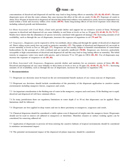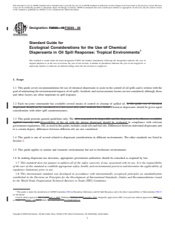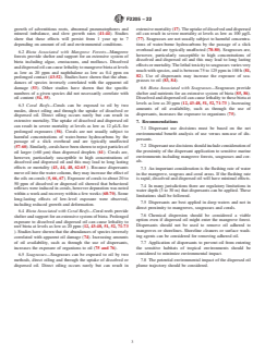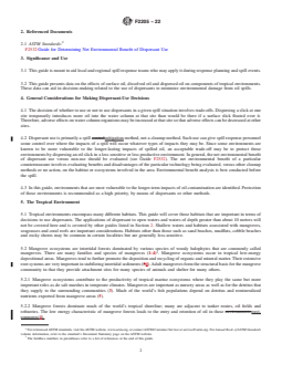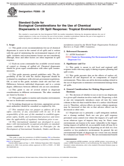 SIGNIFICANCE AND USE 3.1 This guide is meant to aid local and regional spill response teams who may apply it during response planning and spill events. 3.2 This guide presents data on the effects of surface oil, dissolved oil and dispersed oil on components of tropical environments. These data can aid in decision-making related to the use of dispersants to minimize environmental damage from oil spills. SCOPE 1.1 This guide covers recommendations for use of chemical dispersants to assist in the control of oil spills and is written with the goal of minimizing the environmental impacts of oil spills. Aesthetic and socioeconomic factors are not considered; although, these and other factors are often important in spill response. 1.2 Each on-scene commander has available several means of control or cleanup of spilled oil. Chemical dispersants should be given equal consideration with other spill countermeasures. 1.3 This guide presents general guidelines only. The dispersibility of the oil with the chosen dispersant should be evaluated in compliance with relevant government regulations. Oil, as used in this guide, includes crude oils and fuel oils. Differences between individual dispersants and to a certain degree, differences between different oils are not considered. 1.4 This guide is one of several related to dispersant considerations in different environments. The other standards are listed in Section 2. 1.5 This guide applies to marine and estuarine environments but not to freshwater environments. 1.6 In making dispersant use decisions, appropriate government authorities should be consulted as required by law. 1.7 This standard does not purport to address all of the safety concerns, if any, associated with its use. It is the responsibility of the user of this standard to establish appropriate safety, health, and environmental practices and determine the applicability of regulatory limitations prior to use. 1.8 This international standard was developed in accordance with internationally recognized principles on standardization established in the Decision on Principles for the Development of International Standards, Guides and Recommendations issued by the World Trade Organization Technical Barriers to Trade (TBT) Committee.
