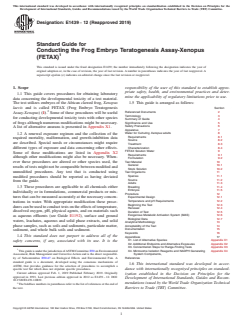 ASTM E1439-12(2019) is a guide published by ASTM International. Its full title is "Standard Guide for Conducting the Frog Embryo Teratogenesis Assay-Xenopus (FETAX)". This standard covers: SIGNIFICANCE AND USE 5.1 FETAX is a rapid test for identifying potential developmental toxicity. Data may be extrapolated to other species including mammals. FETAX might be used to prioritize samples for further tests which use mammals. Validation studies using compounds with known mammalian or human developmental toxicity, or both, suggest that the predictive accuracy will exceed 85 % (2) . When evaluating a test material for mammalian developmental toxicity, FETAX must be used with and without a metabolic activation system (MAS). Use of this exogenous MAS should increase the predictive accuracy of the assay to approximately 95 %. The accuracy rate compares favorably with other currently available “ in vitro teratogenesis screening assays” (3). Any assay employing cells, parts of embryos, or whole embryos other than in vivo mammalian embryos is considered to be an in vitro assay. 5.2 It is important to measure developmental toxicity because embryo mortality, malformation, and growth inhibition can often occur at concentrations far less than those required to affect adult organisms. 5.3 Because of the sensitivity of embryonic and early life stages, FETAX provides information that might be useful in estimating the chronic toxicity of a test material to aquatic organisms. 5.4 Results from FETAX might be useful when deriving water quality criteria for aquatic organisms (4). 5.5 FETAX results might be useful for studying structure-activity relationships between test materials and for studying bioavailability. SCOPE 1.1 This guide covers procedures for obtaining laboratory data concerning the developmental toxicity of a test material. The test utilizes embryos of the African clawed frog, Xenopus laevis and is called FETAX (Frog Embryo Teratogenesis Assay-Xenopus) (1).2 Some of these procedures will be useful for conducting developmental toxicity tests with other species of frogs although numerous modifications might be necessary. A list of alternative anurans is presented in Appendix X1. 1.2 A renewal exposure regimen and the collection of the required mortality, malformation, and growth-inhibition data are described. Special needs or circumstances might require different types of exposure and data concerning other effects. Some of these modifications are listed in Appendix X2 although other modifications might also be necessary. Whenever these procedures are altered or other species used, the results of tests might not be comparable between modified and unmodified procedures. Any test that is conducted using modified procedures should be reported as having deviated from the guide. 1.3 These procedures are applicable to all chemicals either individually or in formulations, commercial products or mixtures that can be measured accurately at the necessary concentrations in water. With appropriate modification these procedures can be used to conduct tests on the effects of temperature, dissolved oxygen, pH, physical agents, and on materials such as aqueous effluents (see Guide E1192), surface and ground waters, leachates, aqueous and solid phase extracts, and solid phase samples, such as soils and sediments, particulate matter, sediment, and whole bulk soils and sediment. 1.4 This standard does not purport to address all of the safety concerns, if any, associated with its use. It is the responsibility of the user of this standard to establish appropriate safety, health, and environmental practices and determine the applicability of regulatory limitations prior to use. 1.5 This guide is arranged as follows: Section Referenced Documents 2 Terminology 3 Summary of Guide 4 Significance and Use 5 Safety Precautions 6 Apparatus 7 Water for Culturing Xenopus adults 8 Requirements 8.1 Source 8.2 Treatment 8.3 Characterization 8.4 FETAX Solution Water 9 Requirements 9.1 Formulation 9.2 ...