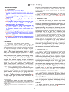 SIGNIFICANCE AND USE 5.1 FETAX is a rapid test for identifying potential developmental toxicity. Data may be extrapolated to other species including mammals. FETAX might be used to prioritize samples for further tests which use mammals. Validation studies using compounds with known mammalian or human developmental toxicity, or both, suggest that the predictive accuracy will exceed 85 % (2) . When evaluating a test material for mammalian developmental toxicity, FETAX must be used with and without a metabolic activation system (MAS). Use of this exogenous MAS should increase the predictive accuracy of the assay to approximately 95 %. The accuracy rate compares favorably with other currently available “ in vitro teratogenesis screening assays” (3). Any assay employing cells, parts of embryos, or whole embryos other than in vivo mammalian embryos is considered to be an in vitro assay. 5.2 It is important to measure developmental toxicity because embryo mortality, malformation, and growth inhibition can often occur at concentrations far less than those required to affect adult organisms. 5.3 Because of the sensitivity of embryonic and early life stages, FETAX provides information that might be useful in estimating the chronic toxicity of a test material to aquatic organisms. 5.4 Results from FETAX might be useful when deriving water quality criteria for aquatic organisms (4). 5.5 FETAX results might be useful for studying structure-activity relationships between test materials and for studying bioavailability. SCOPE 1.1 This guide covers procedures for obtaining laboratory data concerning the developmental toxicity of a test material. The test utilizes embryos of the African clawed frog, Xenopus laevis and is called FETAX (Frog Embryo Teratogenesis Assay-Xenopus) (1).2 Some of these procedures will be useful for conducting developmental toxicity tests with other species of frogs although numerous modifications might be necessary. A list of alternative anurans is presented in Appendix X1. 1.2 A renewal exposure regimen and the collection of the required mortality, malformation, and growth-inhibition data are described. Special needs or circumstances might require different types of exposure and data concerning other effects. Some of these modifications are listed in Appendix X2 although other modifications might also be necessary. Whenever these procedures are altered or other species used, the results of tests might not be comparable between modified and unmodified procedures. Any test that is conducted using modified procedures should be reported as having deviated from the guide. 1.3 These procedures are applicable to all chemicals either individually or in formulations, commercial products or mixtures that can be measured accurately at the necessary concentrations in water. With appropriate modification these procedures can be used to conduct tests on the effects of temperature, dissolved oxygen, pH, physical agents, and on materials such as aqueous effluents (see Guide E1192), surface and ground waters, leachates, aqueous and solid phase extracts, and solid phase samples, such as soils and sediments, particulate matter, sediment, and whole bulk soils and sediment. 1.4 This standard does not purport to address all of the safety concerns, if any, associated with its use. It is the responsibility of the user of this standard to establish appropriate safety, health, and environmental practices and determine the applicability of regulatory limitations prior to use. 1.5 This guide is arranged as follows: Section Referenced Documents 2 Terminology 3 Summary of Guide 4 Significance and Use 5 Safety Precautions 6 Apparatus 7 Water for Culturing Xenopus adults 8 Requirements 8.1 Source 8.2 Treatment 8.3 Characterization 8.4 FETAX Solution Water 9 Requirements 9.1 Formulation 9.2 ...