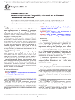 ASTM E918-19: Standard Practice for Determining Limits of Flammability of Chemicals at Elevated Temperature and Pressure provides guidelines for determining the lower and upper concentration limits of flammability for combustible vapor-oxidant mixtures. This practice covers temperatures up to 200°C and initial pressures up to 1.38 MPa (200 psia), and it applies to mixtures with explosion pressures below 13.79 MPa (2000 psia). The standard is essential in the chemical industry for identifying safe operating, storage, and transportation conditions for flammable chemicals, especially under elevated temperature and pressure.