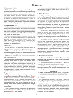 SIGNIFICANCE AND USE 5.1 Knowledge of flammable limits at elevated temperatures and pressures is needed for safe and economical operation of some chemical processes. This information may be needed in order to start up a reactor without passing through a flammable range, to operate the reactor safely and economically, or to store or ship the product safely. 5.2 Limits of flammability data obtained in relatively clean vessels must be carefully interpreted and may not always be applicable to industrial conditions. Surface effects due to carbon deposits and other materials can significantly affect limits of flammability, especially in the fuel-rich region. Refer to Bulletin 503 and Bulletin 627. SCOPE 1.1 This practice covers the determination of the lower and upper concentration limits of flammability of combustible vapor-oxidant mixtures at temperatures up to 200°C and initial pressures up to as much as 1.38 MPa (200 psia). This practice is limited to mixtures which would have explosion pressures less than 13.79 MPa (2000 psia). 1.2 This practice should be used to measure and describe the properties of materials, products, or assemblies in response to heat and flame under controlled laboratory conditions and should not be used to describe or appraise the fire hazard or fire risk of materials, products, or assemblies under actual fire conditions. However, results of this test may be used as elements of a fire risk assessment which takes into account all of the factors which are pertinent to an assessment of the fire hazard of a particular end use. 1.3 This standard does not purport to address all of the safety concerns, if any, associated with its use. It is the responsibility of the user of this standard to establish appropriate safety, health, and environmental practices and determine the applicability of regulatory limitations prior to use. 1.4 This international standard was developed in accordance with internationally recognized principles on standardization established in the Decision on Principles for the Development of International Standards, Guides and Recommendations issued by the World Trade Organization Technical Barriers to Trade (TBT) Committee.