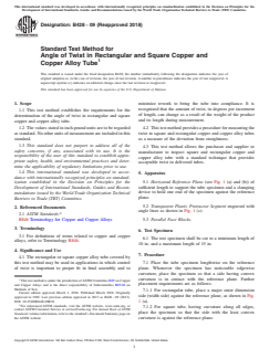 ASTM B428-09(2018) is a standard published by ASTM International. Its full title is "Standard Test Method for Angle of Twist in Rectangular and Square Copper and Copper Alloy Tube". This standard covers: SIGNIFICANCE AND USE 4.1 The rectangular or square copper alloy tube covered by this test method may be used in applications in which control of twist is important to proper fit in final assembly and to minimize rework to bring the tube into compliance. It is recognized that the amount of twist, in degrees per increment of length, can change as a result of the weight of the product and its length during measurement. 4.2 This test method provides a procedure for measuring the twist in square and rectangular copper and copper alloy tubes as a measure of the deviation from straightness. 4.3 This test method allows the purchaser and supplier or manufacturer to inspect square and rectangular copper and copper alloy tube with a standard technique that provides acceptable twist in delivered tubes. SCOPE 1.1 This test method establishes the requirements for the determination of the angle of twist in rectangular and square copper and copper alloy tube. 1.2 The values stated in inch-pound units are to be regarded as standard. No other units of measurement are included in this standard. 1.3 This standard does not purport to address all of the safety concerns, if any, associated with its use. It is the responsibility of the user of this standard to establish appropriate safety, health, and environmental practices and determine the applicability of regulatory limitations prior to use. 1.4 This international standard was developed in accordance with internationally recognized principles on standardization established in the Decision on Principles for the Development of International Standards, Guides and Recommendations issued by the World Trade Organization Technical Barriers to Trade (TBT) Committee.