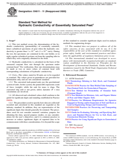 ASTM D4511-11(2020), Standard Test Method for Hydraulic Conductivity of Essentially Saturated Peat, sets forth procedures for determining the hydraulic conductivity (also known as permeability) of saturated, intact cylindrical specimens of peat. Developed by ASTM International, this standard is essential for geotechnical engineering professionals, researchers, and environmental consultants who need accurate, preliminary estimates of peat drainage and compression rates under specific stress conditions. The standard utilizes a constant-head test method to measure water flow through peat specimens, supporting reliable site assessments especially in peatland or organic soil environments.