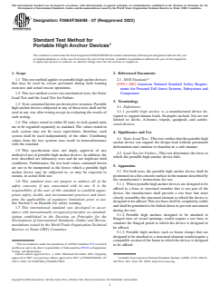ASTM F2684/F2684M-07(2022) is a standard published by ASTM International. Its full title is "Standard Test Method for Portable High Anchor Devices". This standard covers: SIGNIFICANCE AND USE 4.1 Static Load Test—This test verifies that the portable high anchor device can support the design load without permanent deformation and continue to function in a safe manner. 4.2 Load Test for Failure—This test determines the force at which the portable high anchor device fails. SCOPE 1.1 This test method applies to portable high anchor devices that may be used by rescue personnel during both training exercises and actual rescue operations. 1.2 This test method covers two mechanical tests, the Static Load Test and the Load Test for Failure. 1.3 Tests contained herein are destructive in nature. Portable high anchor devices subjected to any of these tests shall not be used in any way after testing except in evaluating the results of such testing. 1.4 The values stated in either SI units or inch-pound units are to be regarded separately as standard. The values stated in each system may not be exact equivalents; therefore, each system shall be used independently of the other. Combining values from the two systems may result in nonconformance with the standard. 1.5 This specification does not imply approval of any method of use of portable high anchor devices. In addition, the tests described are laboratory tests and do not duplicate field conditions. Furthermore, the test load values contained herein are not to be interpreted as the forces which a portable high anchor device may be subjected to, or may be expected to sustain, in actual field use. 1.6 See Section 6 on Hazards for safety warning. 1.7 This international standard was developed in accordance with internationally recognized principles on standardization established in the Decision on Principles for the Development of International Standards, Guides and Recommendations issued by the World Trade Organization Technical Barriers to Trade (TBT) Committee.